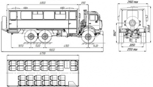 Пассажировместимость 28+2, видеоконтроль пассажирского салона, сидения с 3-х точечными ремнями безопасности, транспортное переговорное устройство, вентиляция — естественная и принудительная.